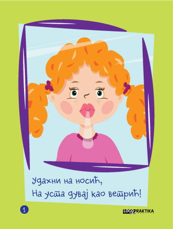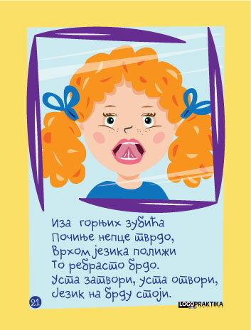 Detetu se pokaže slika, pročita prateća pesmica i pokaže položaj govornih organa ili pokret jezikom koji je prikazan na kartici.