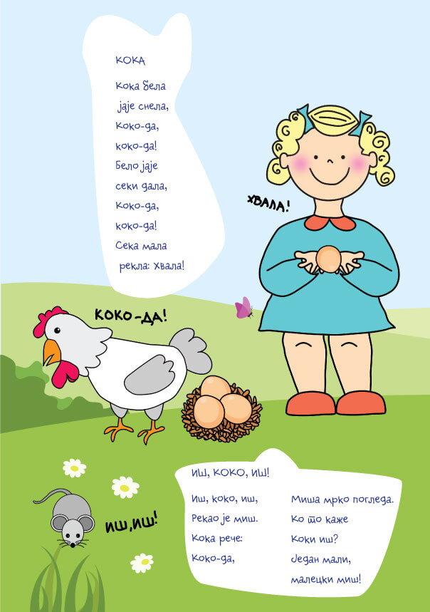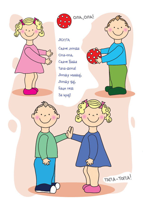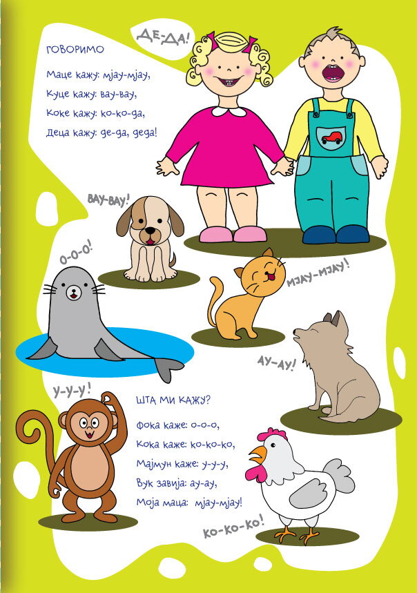 Naše pesmice su prepune onomatopeja, kratkih reči, fraza i stihova koji omogućavaju različite aktivnosti s ciljem da se razvije komunikacija. Čitajte često, ako možete i svakodnevno, ali uvek kada to dete traži od Vas. Zajedno listajte, gledajte, pokazujte, odglumite menjajući boju glasa, visinu ili jačinu glasa, ali uvek jasno i polako da bi dete moglo da prati i razume situaciju. Uradite ono što Vam pesmica govori, tačnije, kombinujte pokrete uz govor, povežite situaciju sa pokretom, Vaše dete će vas s radošću imitirati.