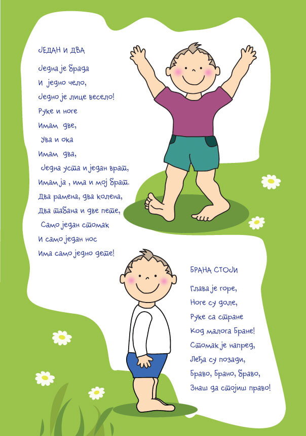Dragi roditelji, Vaše dete će naučiti da govori slušajući govor. Dok je beba, Vaš umirujući ton govora i pesmice koje pevušite zadržavaju pažnju Vašoj bebi. Ona ih rado sluša jer su jasnije od uobičajenog govora i pružaju akustičku i ritmičku stimulaciju koja ih podstiče na pokret. Gledajte Vašu bebu u oči dok govorite ili pevušite. Ona će, slušajući Vas s pažnjom, prvo prepoznati i reagovati na glas, zatim će razumeti situaciju, a kasnije putem mimike, gestova i na kraju rečima, razumeti i učestvovati u komunikaciji sa Vama.