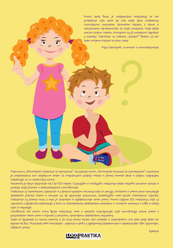 Naša nova knjiga ''Logopedove pitalice za pričalice'' svojim se sadržajem nadovezuje na prethodnu knjigu ''Logopedove pesmice za progovaranje'', prateći tako razvoj govora i jezika kod dece.